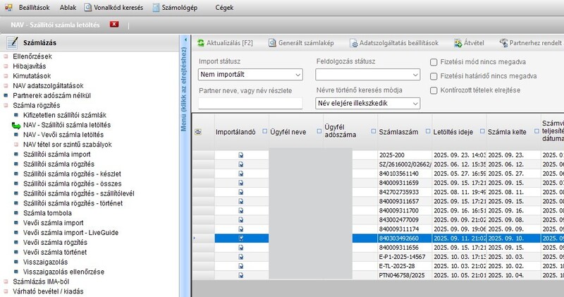 Számlázás / Számla rögzítés / NAV - Szállítói számla letöltés