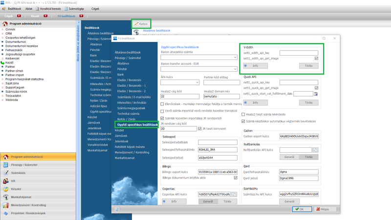Új API adatkapcsolat a V-Edith és a Quick rendszerekkel. A V-Edithből a számla adatok és számlaképek is átemelhetők. A Beállítások /Főbeállítások / Ügyfélspecifikus beállítások V-Edith, illetve a Quick API részen kell megadni az api kulcsot az összeköttetéshez, ez után az Edith számla adatok elérhetőek