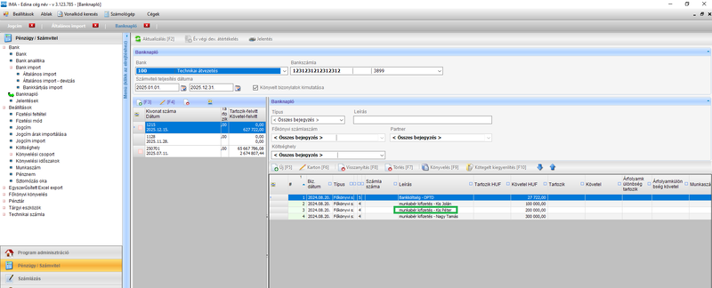 A Bank típusú jogcímekben beállított bankszámla szerinti, közleményben keres megjelölés esetén, a bankimportban megtalált tételeket ráteszi az adott jogcimre, a jogcím megnevezése kerül be a banki "Lerásba", ezt kiegésztve, a megnevezés után - belefűzi a Jogcím bankimportadatban megadott Megnevezés tartalmat, pl. a dolgozó nevét, a bérutalások esetén.