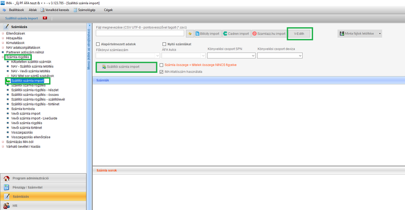• A Számlázás / Számla rögzítés / Szállítói számla import menüpontban a V-Edith gomb használatával  a számla adatok betöltődnek, amik a szokásos módon átemelhetők az ima rögzítési felületekre.