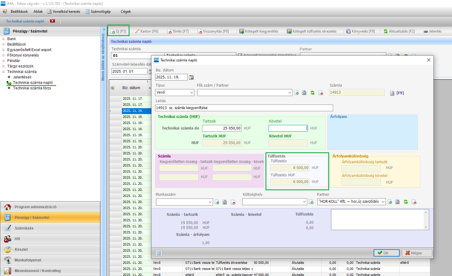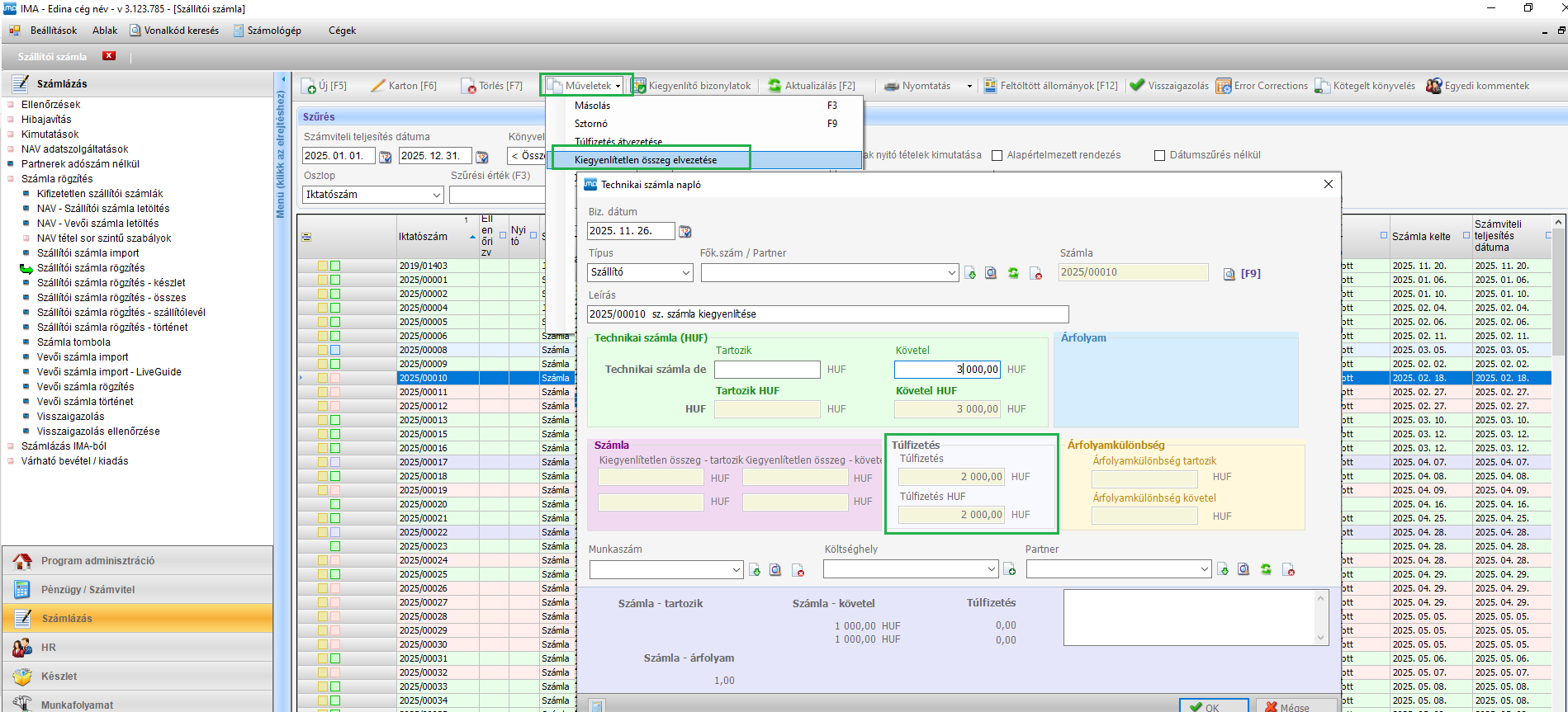 Pénzügy/Számvitel / Technikai számla / Technikai számla napló menüben és a Számla rögzítés Számlázás Imából felületeken a Műveletek / Kiegyenlítetlen összeg elvezetése menüben is, a Technikai számlára történő kiegyenlítésekben mostantól a túlfizetéses kiegyenlítések is engedélyezett a számlákra.