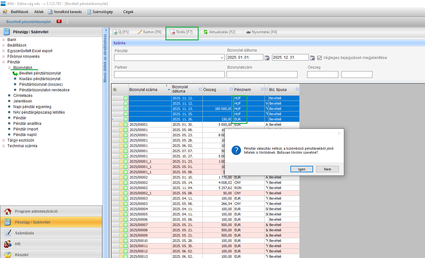 Pénzügy/Számvitel / Pénztár / Bizonylatok / Bevételi pénztárbizonylatok és Kiadási pénztárbizonylatok az itt “igényben” lévő nem véglegesített bizonylatok közül, a kijelöltek, egyben törölhetőek, akkor is, ha az összes pénztárbizonylat nézetből, különböző pénztárakból származnak.