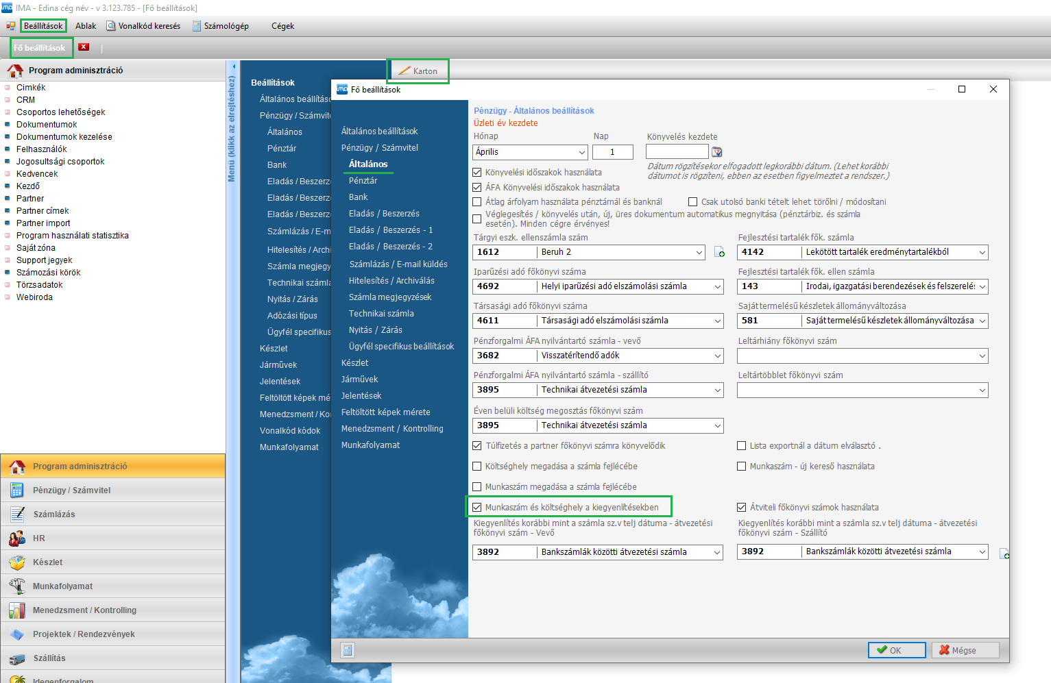 Beállítások / Főbeállítások - Általános - Munkaszám és költséghely a kiegyenlítésekben, ez a funkció a számlán alkalmazott munkaszám és költséghelyeket, a banknapló rögzítési ablakában külön szövegdobozban kiírta. Jelen fejlesztés által, már minden kiegyenlítés esetén tovább viszi a munkasámot és költséghelyet a kiegyenlítési bizonylatokba és az árfolyamkülönbözet könyvelési tételeibe. Amennyiben egy számlán  soronként eltérő munkaszám van megadva, akkor nem ír be semmit a kiegyenlítésbe.
