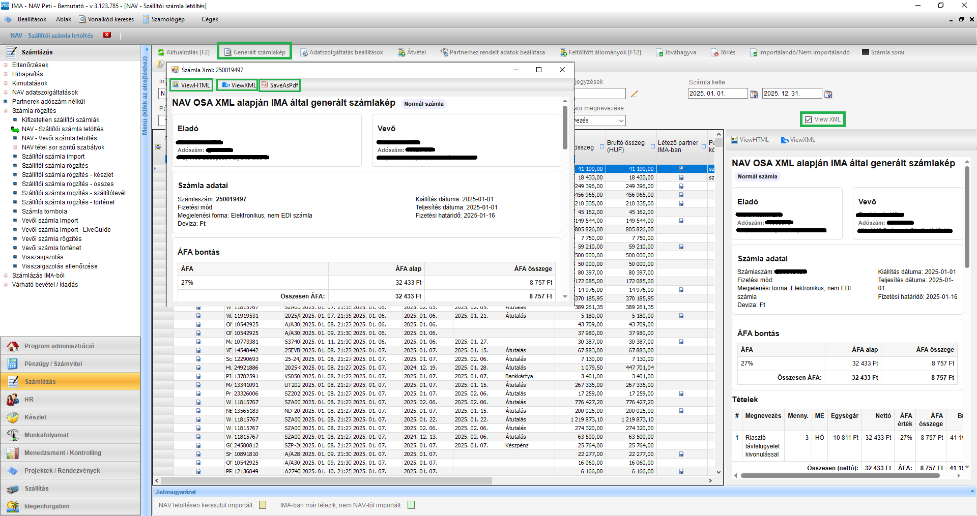 Számlázás / Számla rögzítés / NAV - Szállítói/Vevői számla letöltés - a Generált számlakép menüben, a ViewHTML fülön a NAV-tól kapott xml adatok alapján generált  számlakép látható, a könnyebb átláthatóságért, míg az ablak következő fülén, ViewXML maga a letöltött xml érhető el. A SaveAsPdf fülön a generált számlakép menthető.