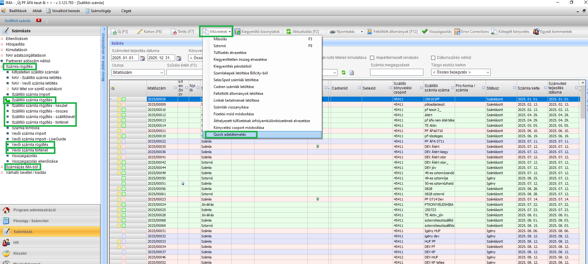 • A számlázás/ Számla rögzítés / Szállítói/Vevői számla rögzítés menüpontokban a / Műveletek/ Quick adatátemelés menüvel a már átemelét számlákhoz hozzárendelhetjük a számlaképeket.