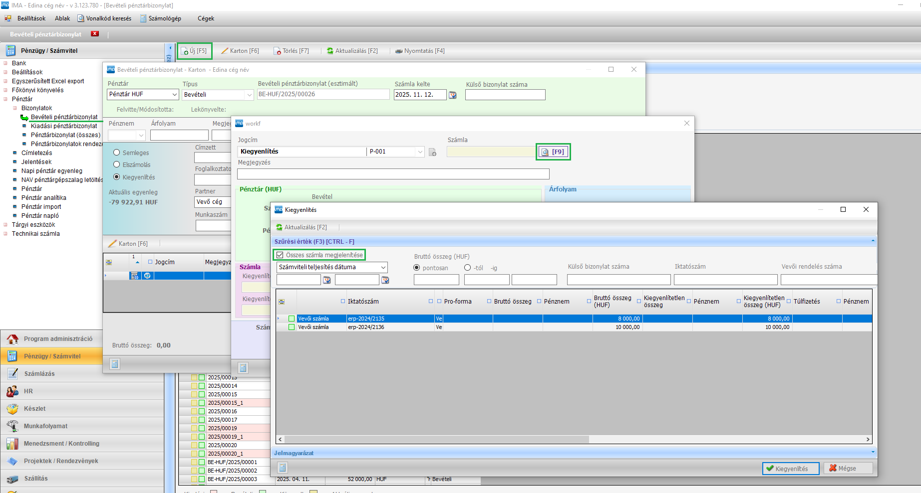 Pénzügy/Számvitel / Pénztár / Bizonylatok / Bevételi pénztárbizonylatok és Kiadási pénztárbizonylatok az innen indított kiegyenlítés típusú pénztárbizonylatokon, a partner választás után az F9-el felkínált számla listában, az Összes számla megjelenítése pipa használatával, a már kiegyenlített, hátralék nélküli számlák is bekerülnek, így túlfizetés rávezetése lehetséges pénztár oldalról is.